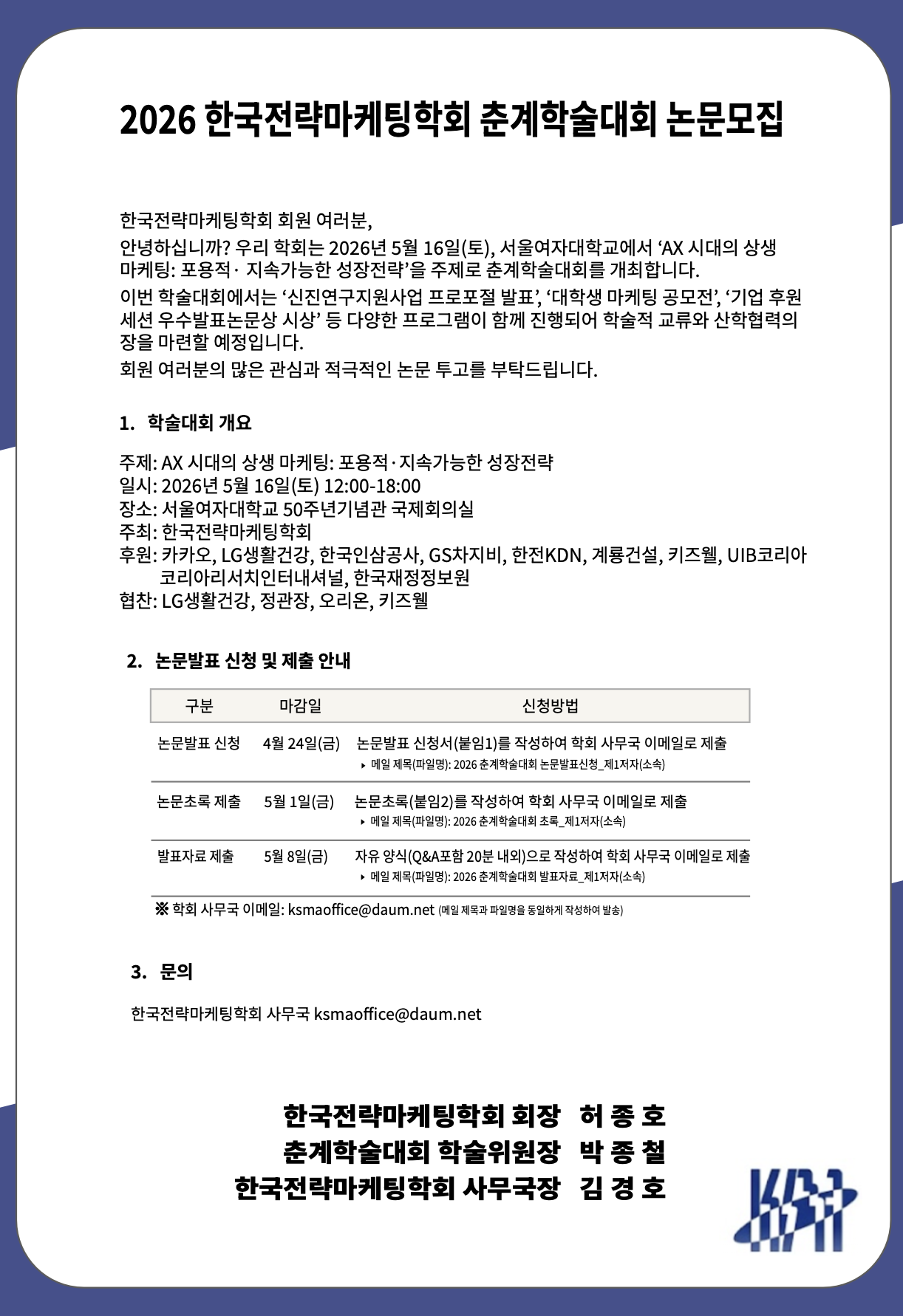| Á¦¸ñ | 2026 Çѱ¹Àü·«¸¶ÄÉÆÃÇÐȸ Ãá°èÇмú´ëȸ ³í¹®¸ðÁý ¾È³»(¸¶°¨: 4/24(±Ý)±îÁö) |
