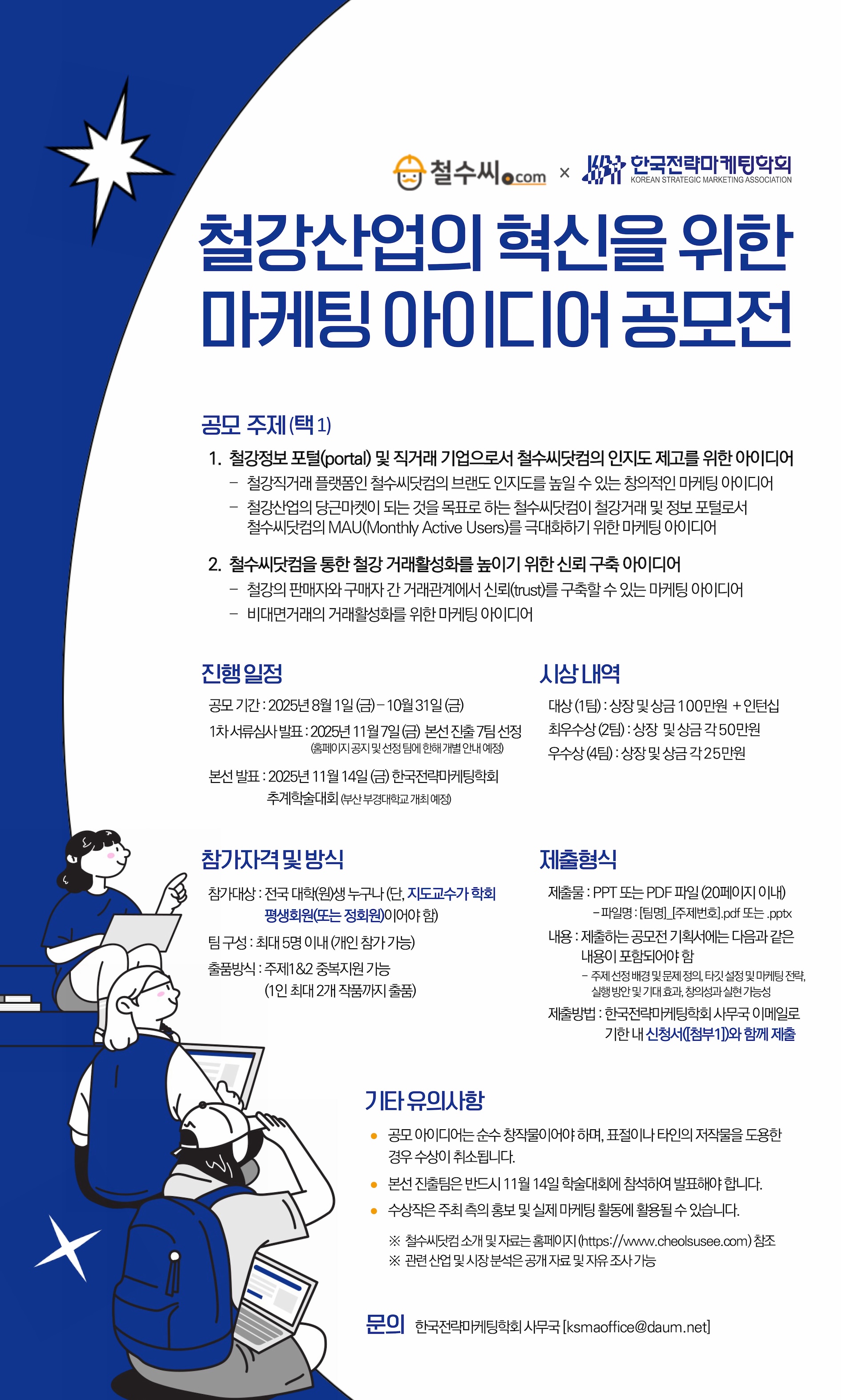 Á¦¸ñ | 2025 Çѱ¹Àü·«¸¶ÄÉÆÃÇÐȸ ´ëÇлý ¾ÆÀ̵ð¾î°ø¸ðÀü ¾È³»(¸¶°¨: 10/31(±Ý)±îÁö) |